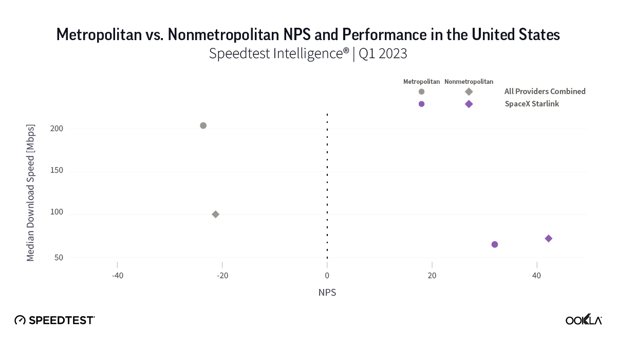 As you see above, the difference in NPS between Starlink and all fixed broadband providers combined is stark: both metro and nonmetro Starlink far outperformed metro and nonmetro ISPs combined for NPS. Metro Starlink had a score of 31.94 compared to -23.62 for all metro fixed broadband providers combined, despite Starlink having a median download speed of 65.29 Mbps compared to 203.93 Mbps for all metro fixed broadband providers combined. Nonmetro Starlink had an even higher NPS at 42.21 compared to nonmetro ISPs at -21.27 — that’s especially notable given that Starlink’s median download speed was much closer to the median nonmetro fixed broadband speed at 72.18 Mbps to 100.41 Mbps.