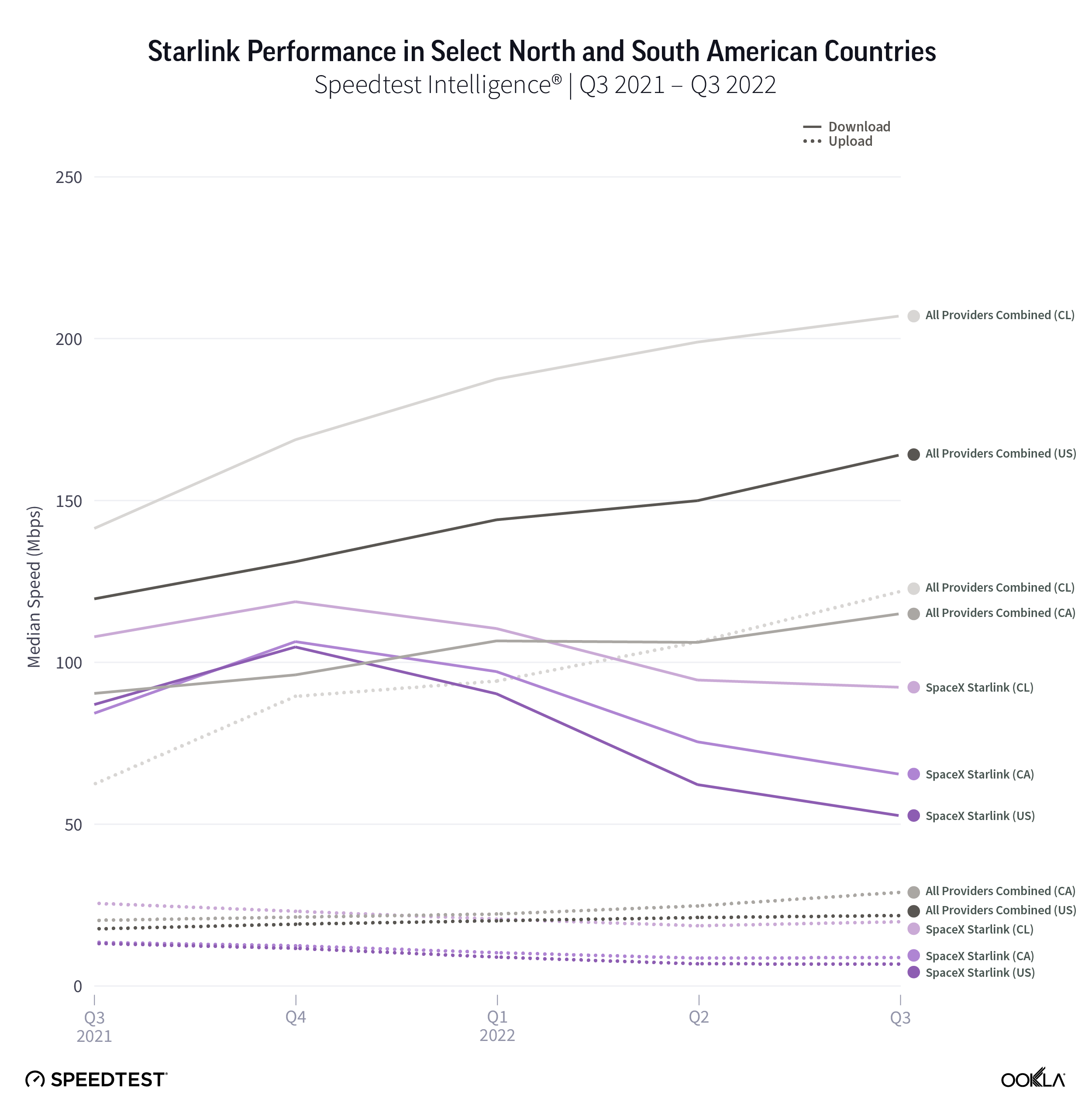 In all six countries, Starlink underperformed all fixed broadband providers combined for upload speed during Q3 2022, lagging behind from 12.59 Mbps to 24.48 Mbps, while median fixed broadband upload speeds ranged from 30.66 Mbps to 93.80 Mbps.