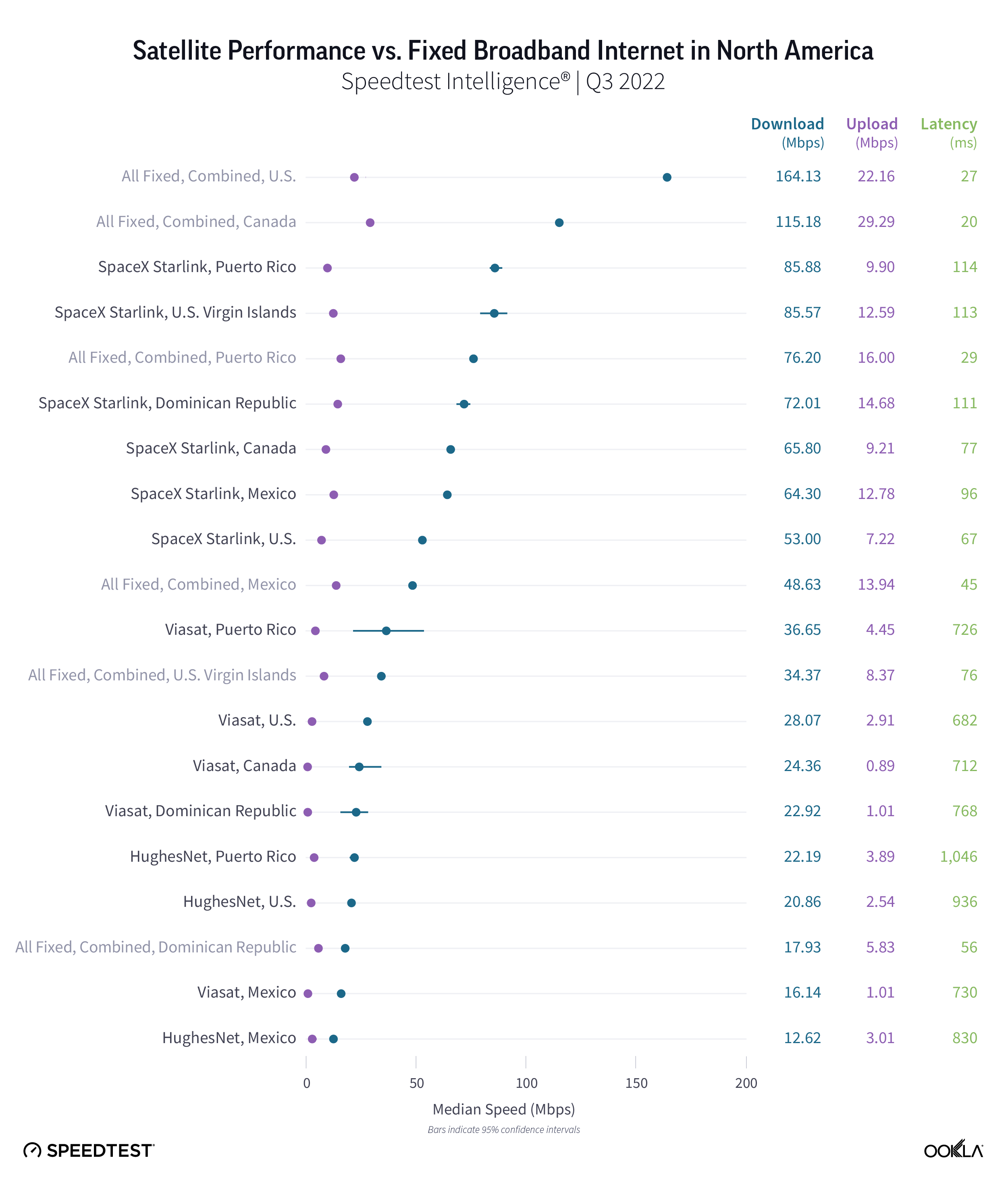 Ookla® has exciting, fresh data from Q3 2022 for SpaceX’s Starlink, HughesNet, and Viasat in North and South America, as well as new Starlink markets we haven’t yet featured in our ongoing series on satellite internet. With accelerating competition on the horizon for 2023, we’ve been eager to see how Starlink continues to perform, especially as building new fiber connections continues to be costly around the world.