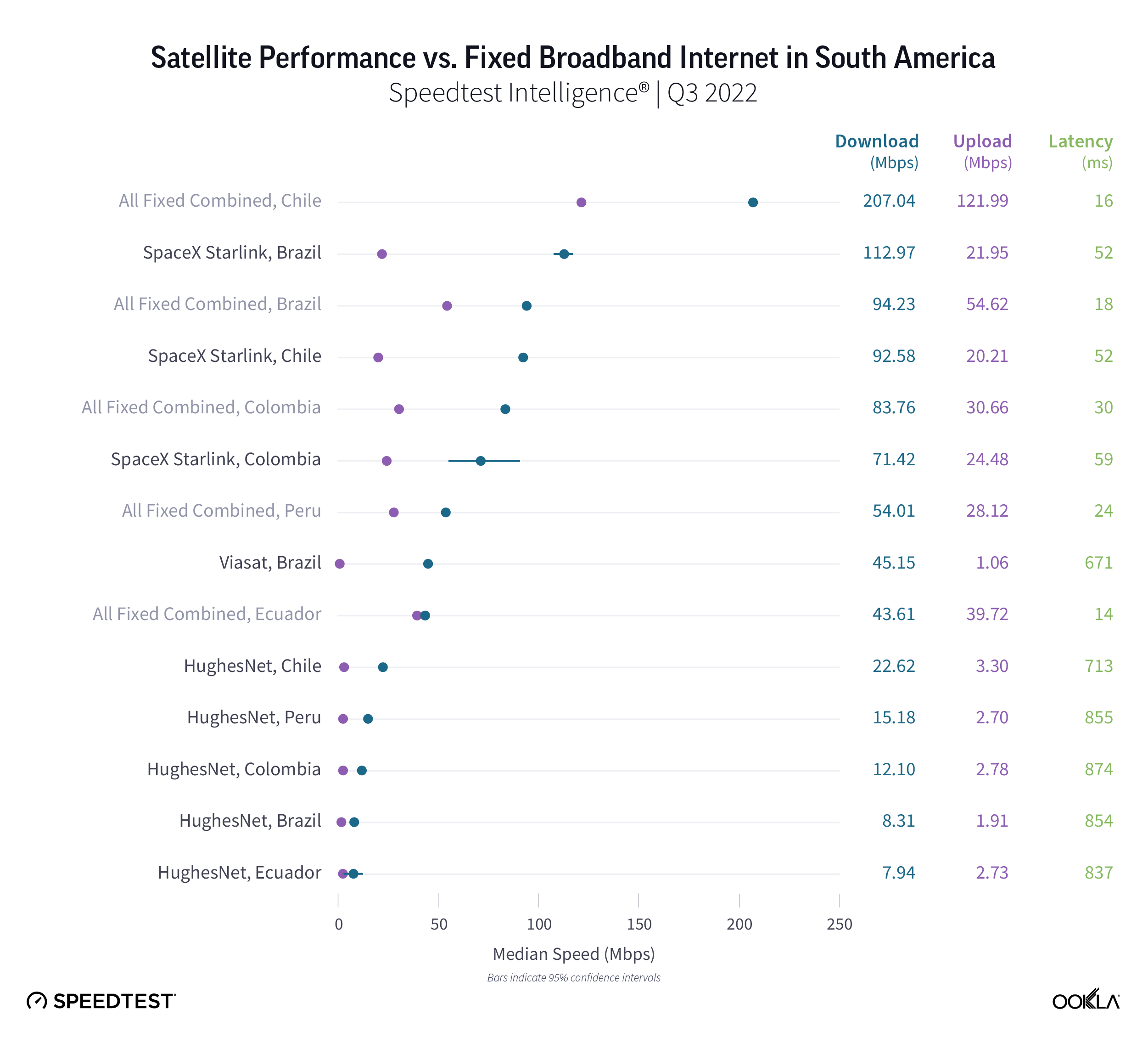 Brazilian satellite consumers weren’t lacking for fast internet options during Q3 2022, with Starlink blazing ahead among satellite providers in South America at 112.97 Mbps. Even Viasat notched a respectable median download speed of 45.15 Mbps. Starlink in Brazil was also the only satellite provider to outperform its country’s fixed broadband speeds, with ultrafast fixed broadband in Chile pulling ahead of Starlink 207.04 Mbps to 92.58 Mbps. Colombia was statistically too close to call in Q3 2022 with Starlink at 71.42 Mbps and fixed broadband at 83.76 Mbps. HughesNet trailed far behind with its fastest speed in Chile at 22.62 Mbps during Q3 2022.
