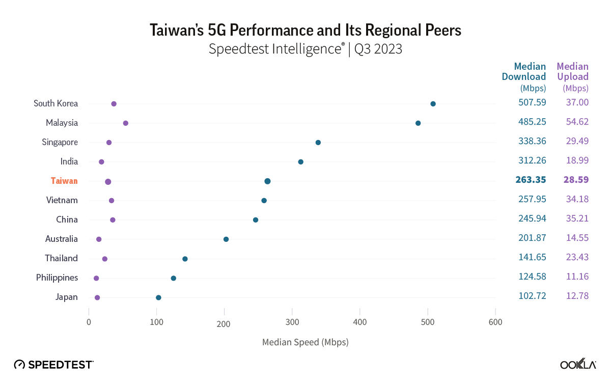 - Taiwan’s 5G network performs well compared to other countries in the region. In Q3 2023, Taiwan’s 5G network had a median download speed of 263.35 Mbps, outperforming other countries in the region, such as Vietnam, China, Hong Kong, the Philippines, and Japan.