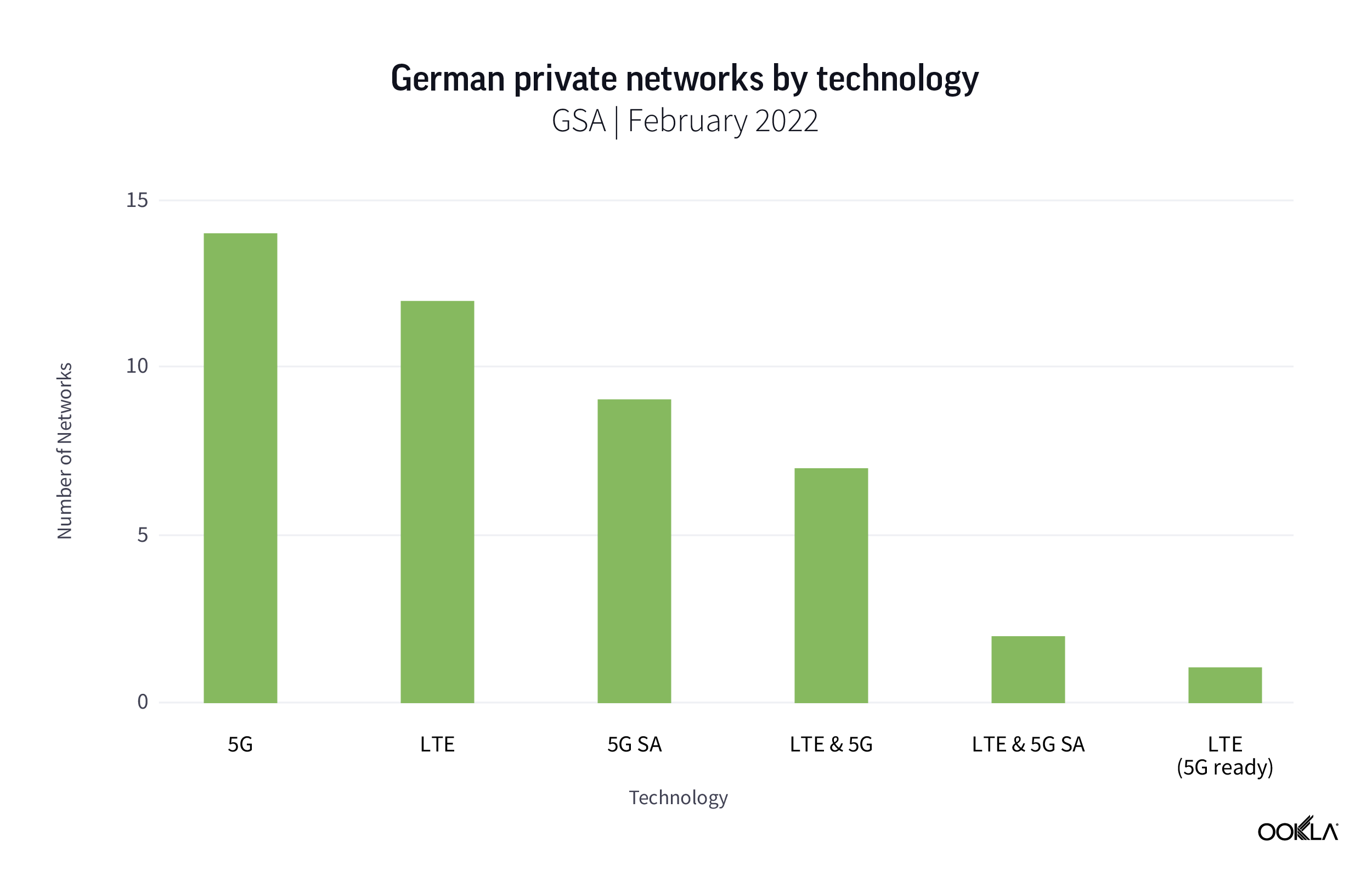 It is important to note that globally, as per the latest GSA data, only 21% of networks were 5G only, and mostly composed of test networks. Until the 5G device ecosystem matures, the majority of private networks will remain 4G/LTE, though using equipment that is 5G ready. Only after the availability of industrial-feature-rich 5G release 16 chipsets, which will happen in the next few years, will the 5G deployments move beyond trials and proof of concept into full scale deployments. Germany is an outlier here: 5G and 5G SA are making headways in Germany. Audi, KUKA, Volkswagen, and Siemens take an active role in testing and deploying 5G SA private networks utilizing localized spectrum in the 3500 MHz band (n78).