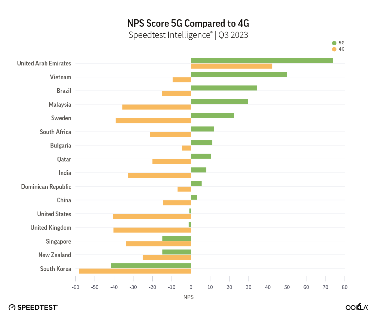 - Speedtest user ratings indicate room for 5G improvement. Despite advancements in 5G technology, there has been a decline in the Net Promoter Score (NPS) among 5G users. Factors contributing to this dissatisfaction could include unmet expectations and discrepancies between actual 5G speeds and advertised speeds.