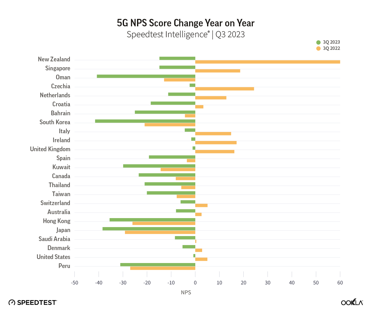 While it is difficult to fully explain the reasons behind the 5G NPS decrease without further research, we can clearly see that network performance isn’t the only factor at play influencing NPS declines. Others can include customer care, pricing, and other services. For example, in South Korea, one of the first countries to launch 5G with one of the world’s fastest speeds, consumers scored 5G networks -41.47 in Q3 2023 compared to -20.51 in Q3 2022.