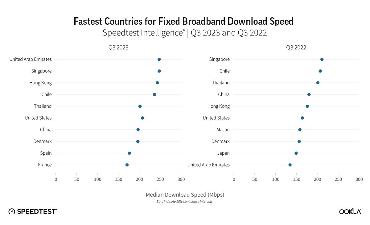 The United Arab Emirates (UAE) and Singapore led the way in fixed network performance.